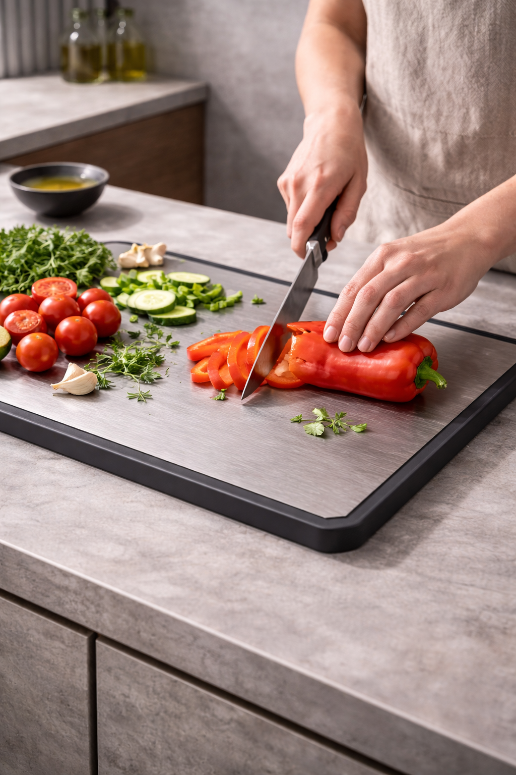 Our titanium prep board replaces porous, reactive surfaces with a cleaner foundation for daily cooking.